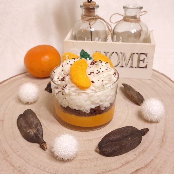 Elle débute par un fond vibrant orange, évoquant la douceur juteuse de la mandarine. Sur ce fond repose un crumble croustillant, apportant une texture et une profondeur inattendues à l'ensemble. Couronnée d'une généreuse couche de chantilly, elle offre une douceur visuelle et olfactive, sur laquelle reposent trois quartiers de mandarine fraîche, gorgés de soleil et d'arômes.