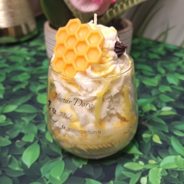 Notre Bougie gourmande Nectar Doré étant du fait main, la création peut varier légèrement. Produit non comestible.